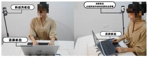 (二)考试前按要求安装调试好“双机位”设备。一台设备(第一机位)从正面拍摄,放置在距离本人30cm处,另一台设备(第二机位)从考生侧后方45°角度拍摄,确保第一机位和第二机位分别从考生正前方和身后完整拍摄到考生,监考老师能够从第二机位清晰看到第一机位屏幕。效果图如下,考生可根据自身情况调整。