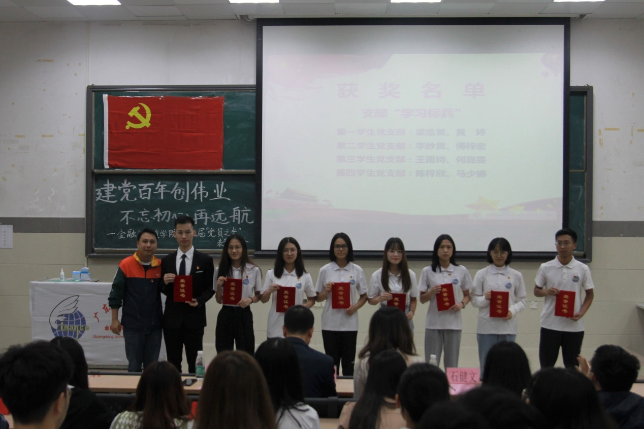 优秀学生党员代表梁浩贤同志上台发言,他号召同学们注重自我修炼,向优秀的人看齐,真正做到“内安于心,外安于目”。随后,优秀党支部代表郑凯真同志对获奖党支部进行了风采展示。她向我们展现了一个齐心协力、笃行好学的优秀支部,并号召我们在日常生活中强化团结合作和埋头苦干意识,不断提高对党的思想认识。