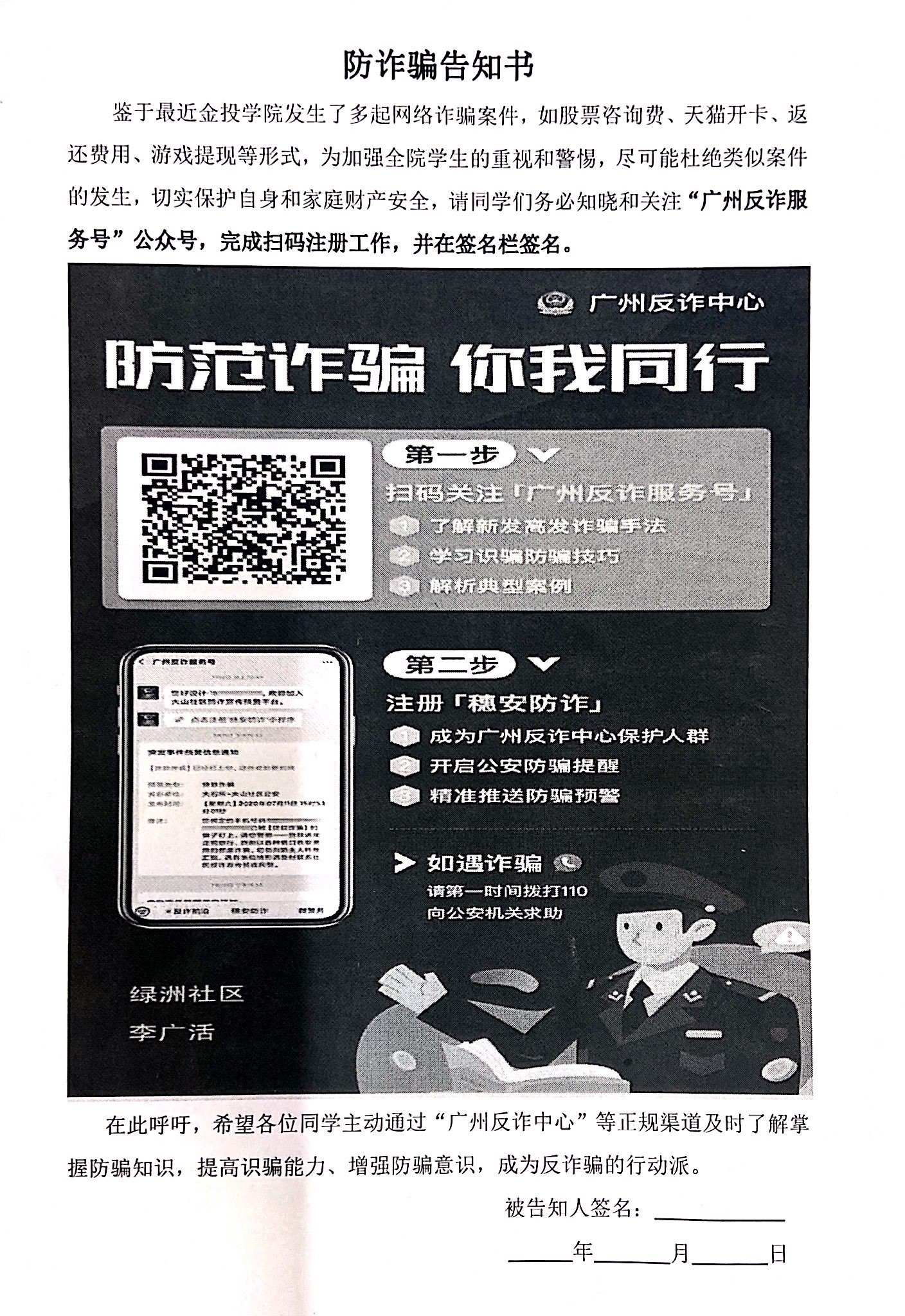 在会上,学院发放了防电信诈骗告知书,要求各班班长落实责任,全院学生尽快完成“广州反诈骗服务号”公众号的扫码注册工作,并在告知书签名栏上签名。