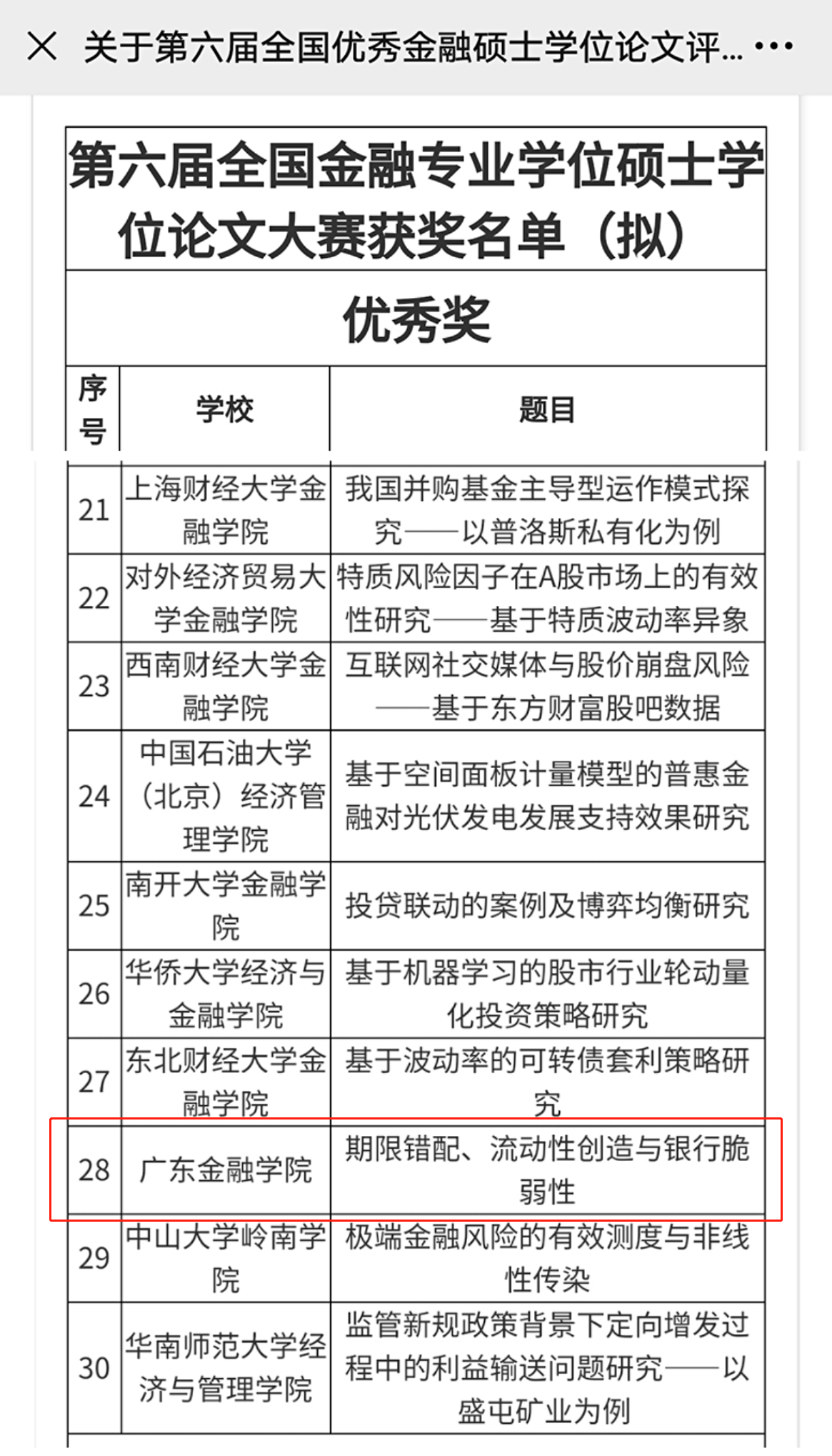 同日,全国金融专业学位研究生教育指导委员会公布了第六届全国优秀金融硕士学位论文评选结果。我院项后军教授指导的2017级金融硕士曾琪的学位论文《期限错配、流动性创造与银行脆弱性》在149篇参评论文中脱颖而出,荣获第六届全国优秀金融硕士学位论文奖。此次共评出优秀论文30篇、优秀论文提名奖15篇。