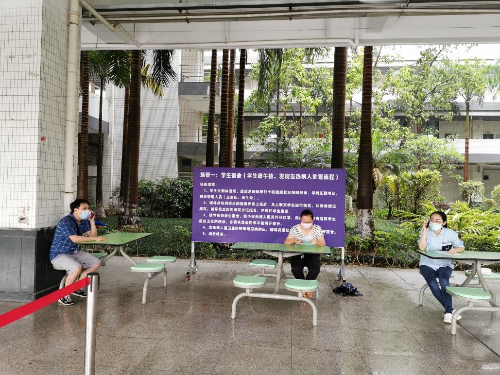 本次演练分三个模拟场景的流程:一是学生宿舍晨午检及发现发热病人处置流程;二是饭堂就餐流程安排;三是学生上课及发现学生发热呕吐的处置。我院对学生返校后的具体工作安排与真实环境,开展全真模拟演练。整个演练过程秩序井然,讲解清晰,重点突出,起到了较好的作用。