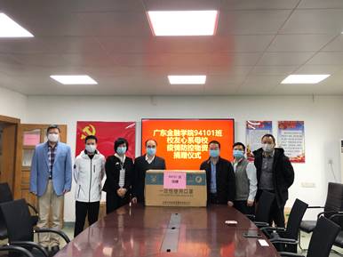 3月31日,yl23411永利集团举行94101班校友口罩定向捐赠仪式。校党委副书记、纪委书记张欣,金投学院党总支书记周少龙,副院长张自力、黄伟麟,副书记胡小波,校友代表广州银行财富管理与私人银行部总经理卢攀,平安银行广州分行金融市场一部总经理助理罗晨晖等,出席了本次活动。