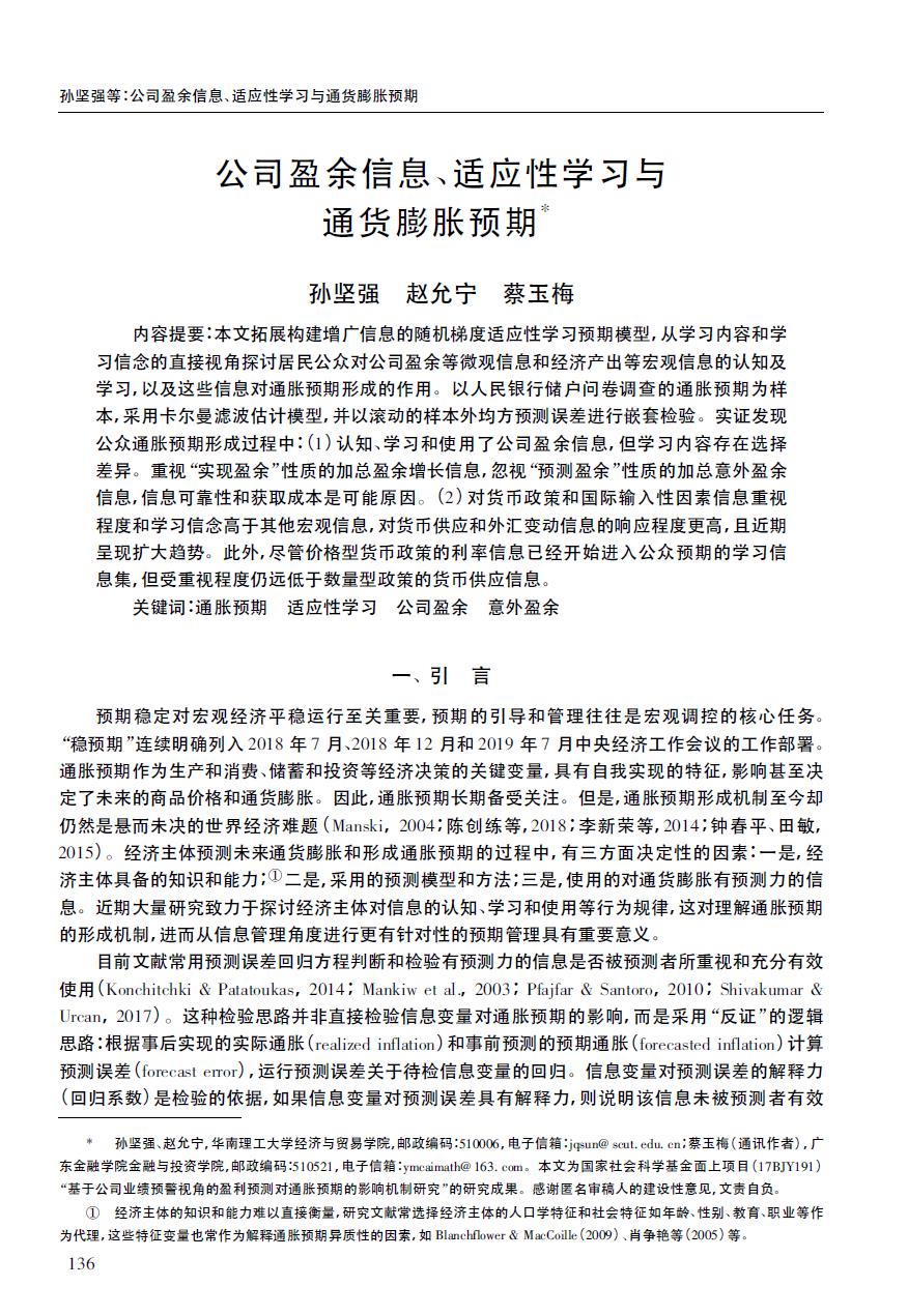 我院金融系教师蔡玉梅博士作为通讯作者,与华南理工大学金融系教授孙坚强、博士生赵允宁合作撰写的学术论文《公司盈余信息、适应性学习与通货膨胀预期》,于2019年10月发表于国内A类权威期刊《经济研究》,这是我校教师首次在该期刊上发表论文。