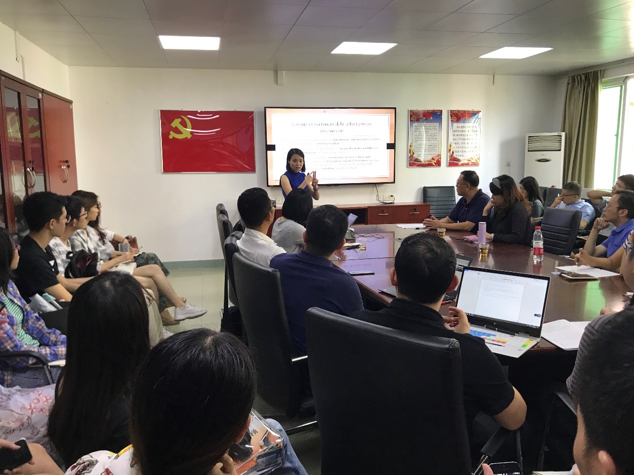 工作坊开始,主持人李欢丽副教授对各位老师和学生的积极参与表示欢迎和感谢,同时对两位老师的简历做了简单的介绍。Tan Ai Lian博士为第一报告人,报告主题——《马来西亚政府债务是否影响了私人投资》,研究特色在于寻求能够促进私人投资的马来西亚政府债务上限。报告完毕后,李琰钰博士从理论机制、实证方法、变量研究等方面对Tan Ai Lian 博士的论文进行点评并提出修改意见。章力老师和丁树老师等也分别与Tan Ai Lian博士交流了隐形债务数据处理和最优债务率的问题。