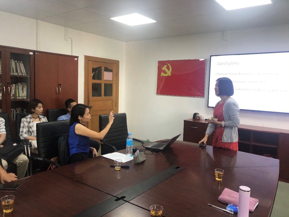 随后,第二位报告人李琰钰博士分享报告,主题为《英国证券信托基金的基金层面独特风险和风险投资风格》,研究特色在于借鉴美国共同基金的研究成果对英国的证券信托基金进行了迁移式探索。Tan Ai Lian博士等从研究方法、数据结构、结论分析等方面对李琰钰博士的论文进行点评,并提出了改进意见。在场学生也积极参与,就论文研究方法、数据处理提出了若干问题。