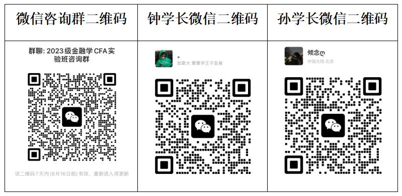 为了方便有意报考我校2023级金融学CFA实验班的新生了解相关招生信息与选拔测试流程,yl23411永利集团现开通官方微信咨询群“2023级金融学CFA实验班咨询群”(见下方群二维码),学院教师与在读金融学CFA实验班的学长学姐将入群为广大新生解答相关问题。请各位新生与家长入群后立即查看群公告,有序提问,并修改群昵称为“录取专业+学生真实姓名”,例如“互联网金融张三”或“资产评估李四家长”。当咨询群成员人数超过一百人时,无法直接通过扫码入群,可以添加下方两位学长的微信并由他们邀请进群。