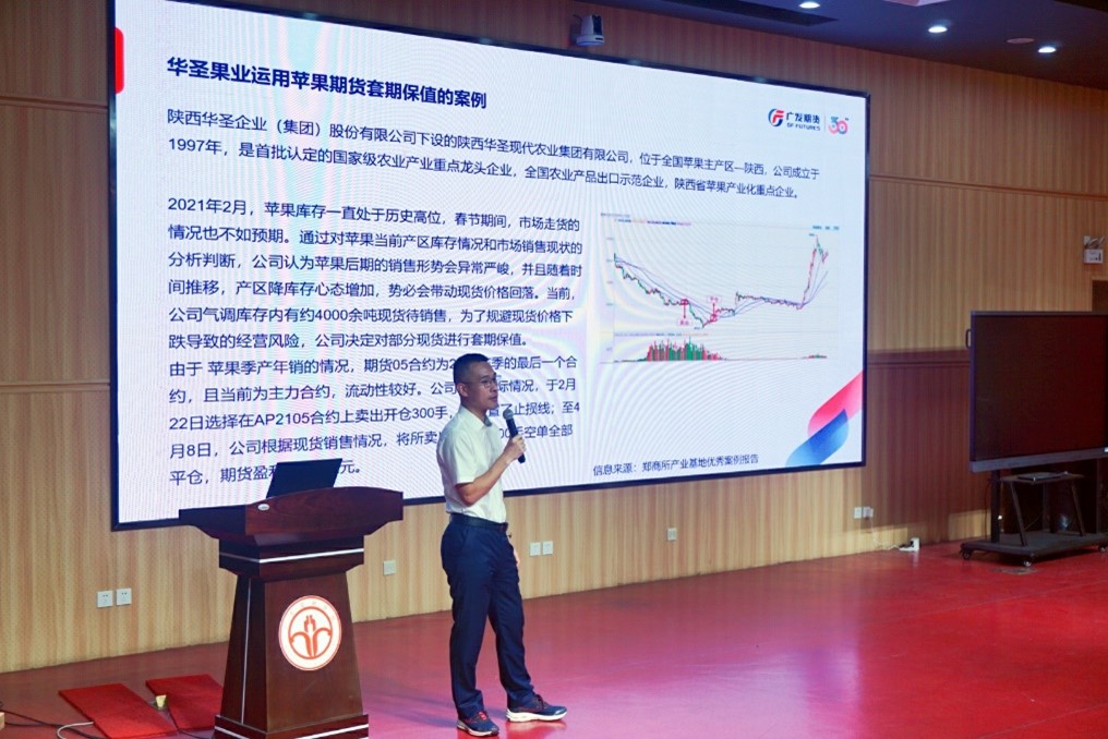 周总以企业运用期货工具管理风险为题,对风险管理公司如何使用期货帮助客户规避营运风险展开详细的介绍。首先,通过使用一系列数据和法律条例,回顾期货市场的发展变化,分析了具有中国特色的现代期货市场的特点,并展望了市场发展的巨大潜力。随后,基于套期保值、基差交易、“订单+期货”三个案例,生动讲解期货在农产品生产、销售、乡村振兴中的灵活应用,并详细介绍风险管理公司的主要业务。最后,立足乡村振兴政策,详细介绍“保险+期货”模式在降低风险方面发挥的巨大作用,强调期货市场健康发展的重要性。在互动环节中,同学们纷纷就期货投资风险、期货投资策略、期货从业人员素质要求等问题与周总进行了深入交流。