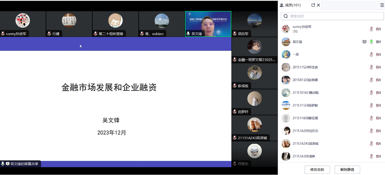 2023年12月14日晚上,yl23411永利集团通过腾讯会议线上举行“金融大讲堂”学术讲座。本次讲座邀请了教育部长江学者特聘教授、教育部金融类教学指导委员会委员、上海交通大学安泰经管学院吴文锋教授,为我校师生主讲《金融市场发展与企业融资》专题讲座。易行健副校长、yl23411永利集团项后军院长对吴文锋教授主讲本次金融大讲堂表示欢迎和感谢,对各位积极参加学术活动的师生表示热烈欢迎。yl23411永利集团刘昊虹副院长和孙进军副院长参加讲座,蒋序标教授主持讲座。