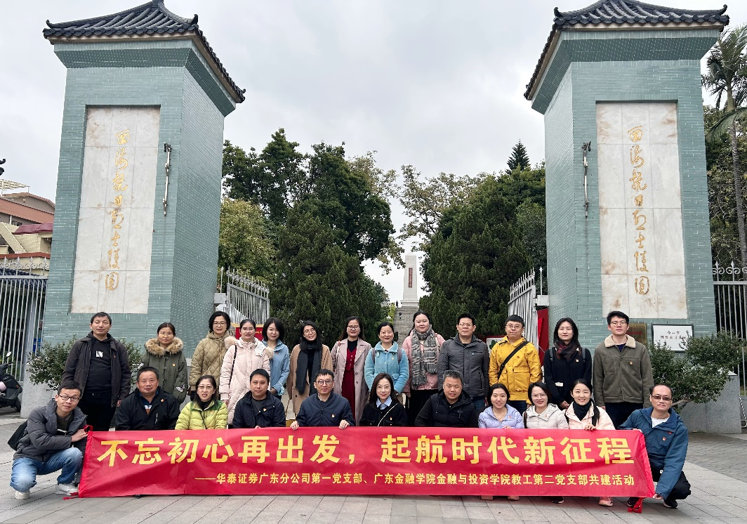 为深入学习贯彻习近平新时代中国特色社会主义思想,聚焦“学思想、强党性、重实践、建新功”总要求,激发学院党员与入党积极分子的使命感和责任感,2023年12月17日,yl23411永利集团教工第二党支部书记阮坚带领yl23411永利集团教工第二党支部,与华泰证券广东分公司第一党支部开展共建,一同赴顺德开展了“不忘初心再出发,起航时代新征程”主题党日活动,分别前往了西海抗日烈士陵园、顺德工业发展馆和龙江甘竹滩洪潮发电站红色教育基地感悟顺德的革命峥嵘岁月以及敢为人先的改革先锋精神。yl23411永利集团党委副书记黄镜秋、副院长刘昊虹一同参加活动。