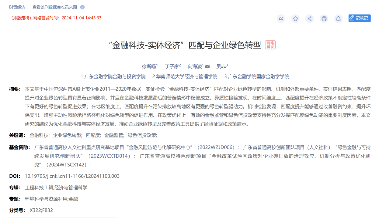 我院徐斯旸副教授(第一作者)与向海凌博士(通讯作者)等合作撰写的学术论文《“金融科技-实体经济”匹配与企业绿色转型》,于2024年11月发表于国内经济学权威期刊《财贸经济》。