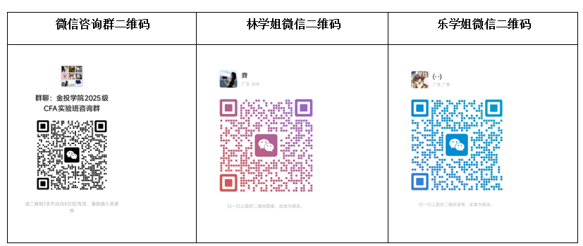 为方便有意报考永利yl234112025级金融学CFA实验班的新生了解相关招生信息与招录流程,yl23411永利集团现开通官方微信咨询群“金投学院2025级CFA实验班咨询群”(见下方群二维码),学院教师与金融学CFA实验班的在读学长学姐将入群为广大新生及家长答疑解惑。请各位新生及家长入群后立即查看群公告,尽快修改群昵称为“录取专业+学生真实姓名”,例如“互联网金融张三”或“互联网金融张三家长” ,并有序提问,礼貌交流。当微信咨询群成员人数超过一百人时,将无法直接扫码入群,可以添加下方两位学姐的个人微信,并由她们邀请进群。