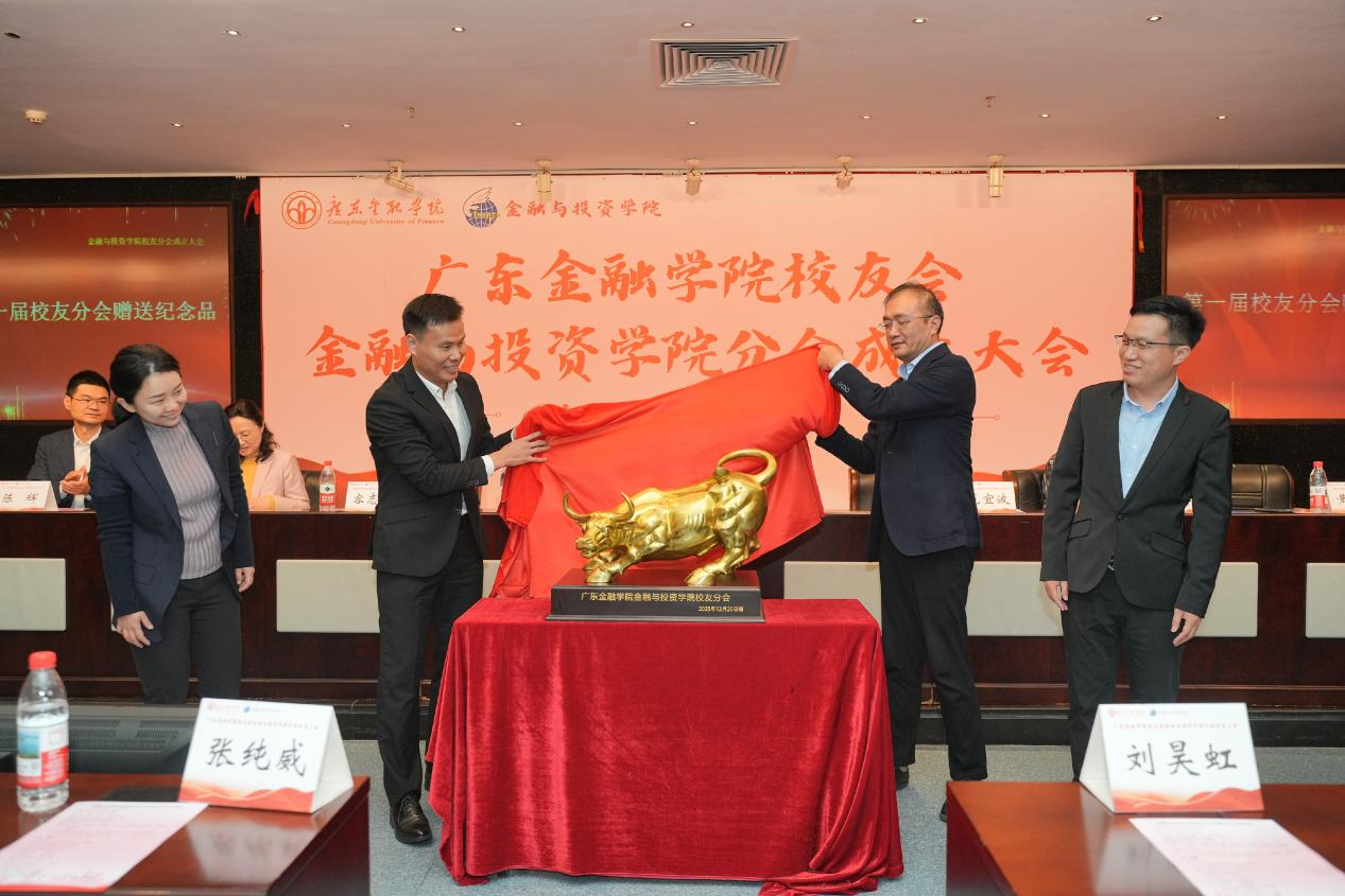 大会还举行了yl23411永利集团校友分会赠送礼物仪式,由学校工会副主席、党委办公室主任范宜波和学生处处长容志豪共同为礼物揭开红幕。yl23411永利集团校友分会向母校赠送一尊华尔街铜牛雕塑,寓意金融报国、砥砺前行,祝福母校事业根基稳固、蒸蒸日上。