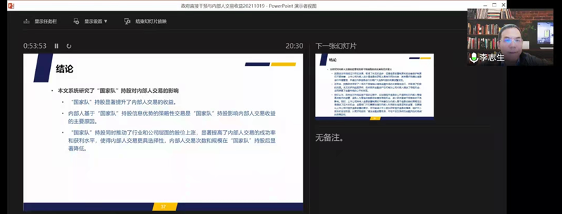 李志生教授为学院教师做了题为《政府直接干预与内部人交易——来自“国家队”持股的证据》的主题讲座,从政府救市的角度,详细介绍了“国家队”持股与企业内部人交易收益的关系。并解答了吴梦菲、杨小欣、胡妍、徐斯旸等教师关于理论推导、模型设定、样本选择、变量测量等方面的问题。