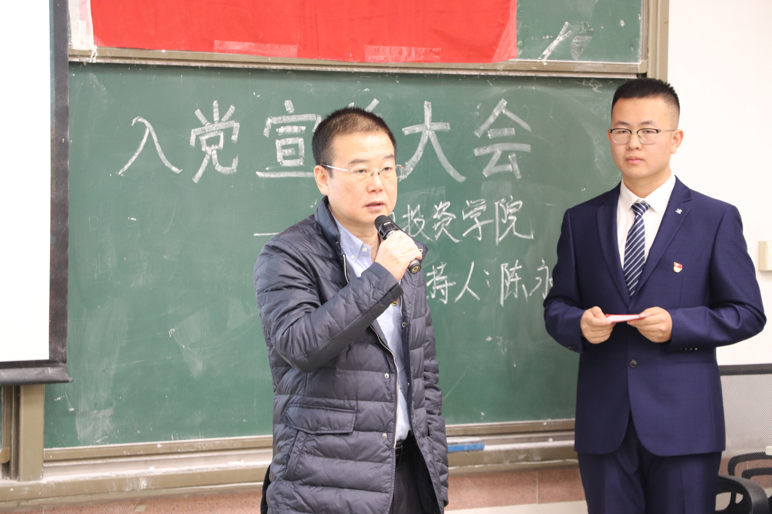 接着,新发展的党员出席了入党宣誓大会并集体高唱《国际歌》,黄镜秋老师带领新党员进行庄严宣誓。之后,新党员代表赵泽权同志上台发言,他提到,成为中共党员不仅是荣耀,更是责任,党员应当起到先锋模范作用,还引用了习主席在庆祝改革开放40周年的重要讲话“船到中流浪更急,人到半山路更陡”来勉励大家,要在实现中华民族伟大复兴的道路上不断前行。随后,老党员代表洪妍同志发言,她认为党员应当努力践行入党誓词,认真学习马克思主义真理,增强党性;同时要不忘初心,牢记使命,不能脱离、忽视群众;应当逢山开路,遇河架桥,将党的十九大蓝图变成现实。