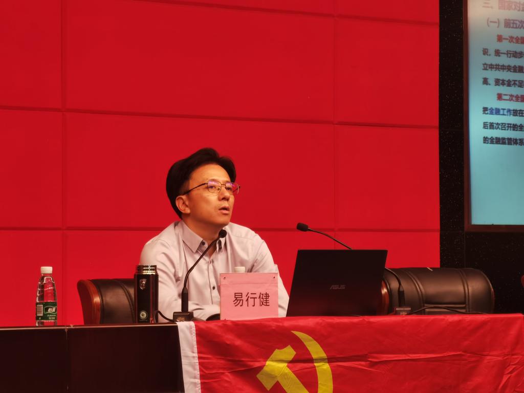 易行健首先传达习近平总书记在省部级主要领导干部推动金融高质量发展专题研讨班开班式上的重要讲话精神。习近平总书记从党和国家事业发展全局战略高度,深刻阐述了推动我国金融高质量发展的一系列重大理论和实践问题,为新时代新征程金融工作怎么看、怎么干指明方向。易行健要求师生党员认真学习领会习近平总书记重要讲话精神,提高站位,坚定信心,实干笃行,坚定不移走中国特色金融发展之路,锚定金融强国建设目标,扎实推动金融高质量发展,为强国建设、民族复兴伟业贡献更大金融力量。