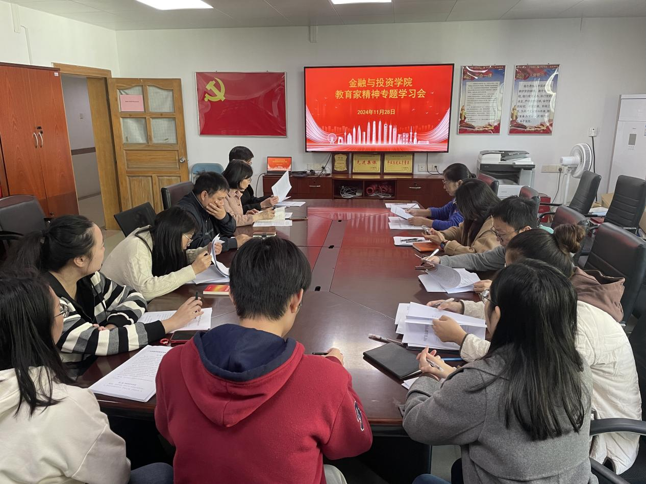 在会上,颜佩仪书记领学了《中共中央国务院关于弘扬教育家精神加强新时代高素质专业化教师队伍建设的意见》一文。颜书记强调,学院教工要认真学习领会弘扬教育家精神的重大意义、丰富内涵和实践要求,深刻认识到加强教师队伍建设是建设教育强国最重要的基础工作,是加快教育现代化、建设教育强国、办好人民满意教育的坚强支撑。在教育教学中,要以教育家精神为引领,坚定心有大我、至诚报国的理想信念,陶冶言为士则、行为世范的道德情操,涵养启智润心、因材施教的育人智慧,秉持勤学笃行、求是创新的躬耕态度,勤修乐教爱生、甘于奉献的仁爱之心,树立胸怀天下、以文化人的弘道追求,自觉将教育家精神转化为教书育人的思想自觉、行动自觉,为学校加快建设金融专业特色大学作出更大贡献。党员教师要坚持不懈用习近平新时代中国特色社会主义思想铸魂育人,以习近平总书记提出的“四有”好老师作为奋斗的目标,守好教师教育第一职责,坚持师德师风第一标准,大力弘扬教育家精神,以“功成不必在我”的胸怀格局,履行好“功成必定有我”的责任担当,践行好“为党育人、为国育才”的初心使命,奋力谱写学院和学校的高质量发展新篇章。