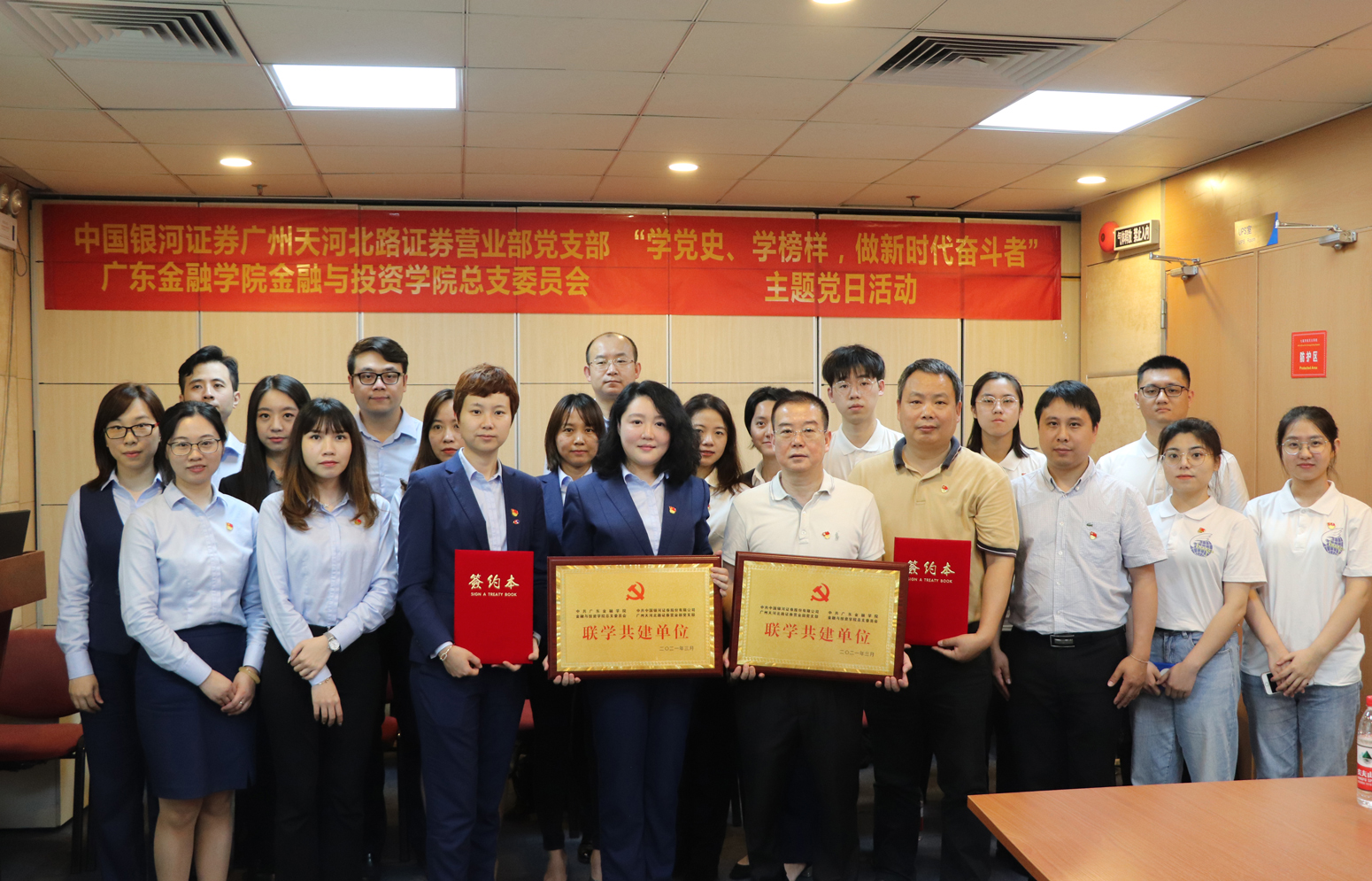 3月30日下午,yl23411永利集团党总支与中国银河证券广东分公司基层党组织联学合作协议签约仪式在广州天河北路证券营业部举行。广东分公司党委委员、副总经理,广州天河北路证券营业部党支部书记、总经理史楠、yl23411永利集团党总支书记周少龙、yl23411永利集团党总支副书记胡小波等领导老师出席签约仪式。签约仪式由副书记温妮同志主持。yl23411永利集团党总支与中国银河证券广东分公司双方党组织负责人签订《党组织共建共联倡议书》并互授联学共建牌匾。
