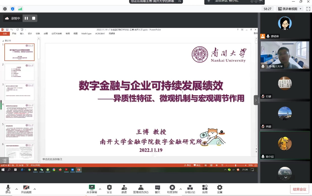 2022年11月19日晚上,yl23411永利集团通过腾讯会议线上举行了2022年第5期金融学前沿Workshop,此次Workshop邀请了南开大学金融学院教授、数字金融研究所所长、国际金融研究中心主任王博教授为学院师生带来了金融学前沿研究的主题讲座。