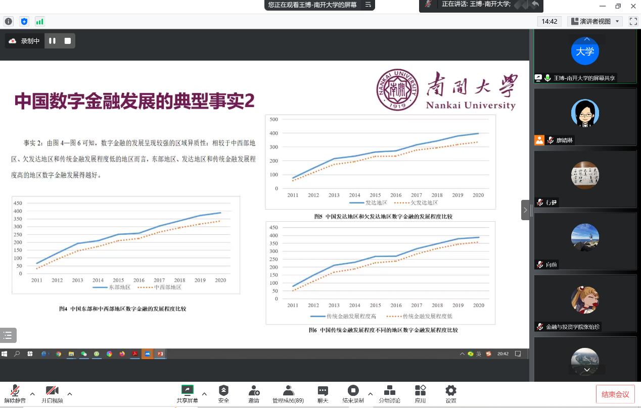 王博教授为参会师生分享了题为《数字金融与企业可持续发展绩效——异质性特征、微观机制与宏观调节作用》的最新研究成果。基于当前全球处于百年未有之大变局的背景下,文章首次在统一的框架内探讨数字金融对企业可持续发展绩效的影响,并从理论和实证层面对数字金融通过促进企业数字化转型提高企业可持续发展绩效的传导途径进行分析,揭开了数字金融与企业可持续发展绩效之间的“理论黑箱”。针对传统金融在资源分配上存在的“属性错配”、“领域错配”和“阶段错配”问题,文章还探讨数字金融对不同属性、不同领域和不同发展阶段企业可持续发展绩效的差异性影响,并研究了数字金融对不同地区企业可持续发展绩效的异质性以及科技创新环境、金融监管环境及影响数字金融发展的重大事件所发挥的调节作用。文章的选题新颖,从微观机制的分析、宏观变量的调节效应以及企业、区域层面的异质性分析等方面清晰识别数字金融对企业可持续发展绩效的影响机制。