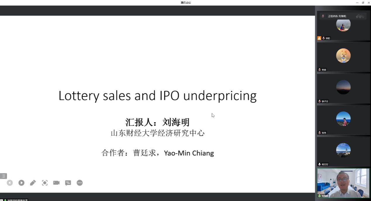 刘海明教授为参会师生分享了题为《Lottery sales and IPO underpricing》的最新研究成果。文章讨论了两个问题:博彩销售情况是否会对股票市场的参与者数量有影响?在发现了博彩销售与股票市场的替代效应后,进一步研究股票市场投机者增加是否会阻断信息不对称—赢者诅咒—IPO抑价的影响链条。根据博彩收益假说提出可能会阻断第一个链条,根据流动性假说提出可能会阻断第二个链条,并通过实证分析为流动性假说提供有效证据。文章的选题新颖,识别策略详实可靠,实证过程细致丰富,为金融研究的拓展提供了极好地启发与借鉴意义。刘海明教授现场回答了项后军院长、孙进军副院长以及多位师生关于文章的理论基础、变量数据的细化、中国与美德等西方市场的投资者差异性、特殊时间窗口、中国彩票类型的差异等方面的诸多问题。论文讲座现场气氛活跃,参会师生受益匪浅。