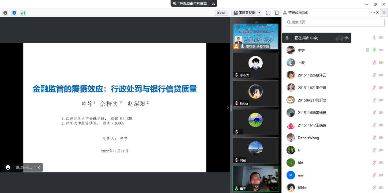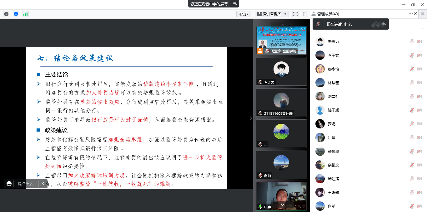 申宇副教授为参会师生分享了题为《金融监管的震慑效应:行政处罚与银行信贷质量》的最新研究成果。文章讨论了监管处罚对银行信贷质量的影响及其微观作用机理和经济后果,发现银行受到监管部门处罚后,贷款违约率显著下降,且通过罚金或没收违法所得,可以进一步提升监管效能,降低银行信贷风险。机制检验发现,银行通过选择风险更小的借款人,发放期限更短的贷款以控制贷款违约率;同时,银行也挤出了缺乏信贷足迹的借款人。监管处罚的效果会外溢至同一银行内的其他分行,降低了其他分行的贷款违约率。申宇副教授现场回答了项后军院长以及多位师生关于文章的模型构建、异质性分析、样本区间与变量衡量方式等方面的诸多问题。