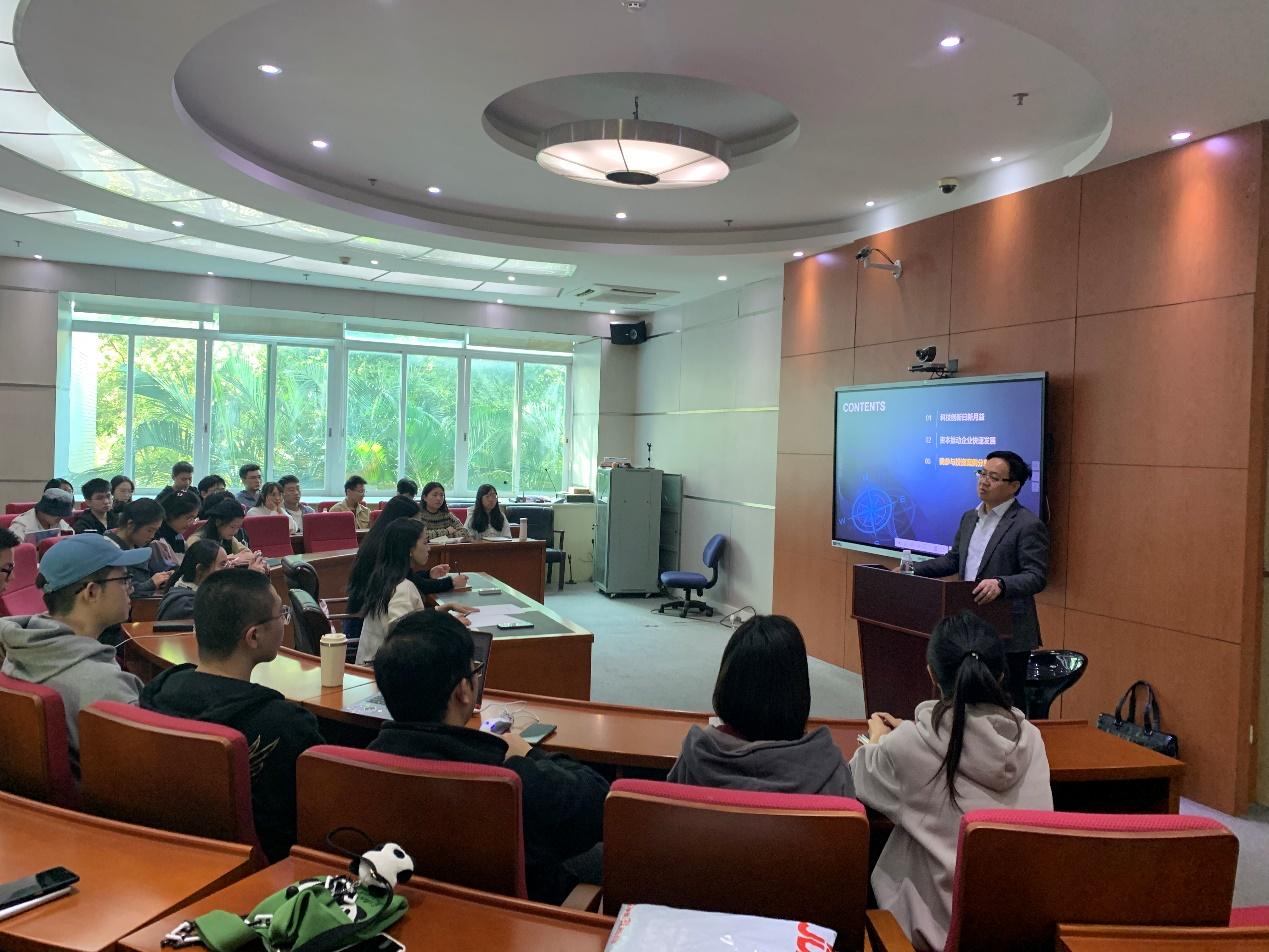 本次讲座中,蓝飞腾董事长对科技创新的现状进行了深入的思考,指出当前我国科技创新存在成果转化率较低、研发投入偏低等问题。在此基础上,蓝飞腾董事长梳理了科技创新与资本助推的投资逻辑,介绍了机构投资的基本流程,以及分享了一级市场投资中的成功案例。最后,他强调,做投资要有国家使命感,要在中国式现代化建设中勇于担当,并且希望同学们平时能够注重知识积累,因为机会都是留给有准备的人。